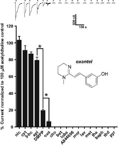Figure 4. Effects of nAChR agonists and anthelmintics on Asu‐ACR‐16. Sample traces and bar chart (mean ± SEM) showing rank order potency series for nAChR agonists: nicotine (nic), cytisine (cyt), 3‐bromocytisine (3‐bc), epibatidine (epi), DMPP, choline (cho), betaine (bet), lobeline (lobe) and A844606; and cholinergic anthelmintics: oxantel (oxa), morantel (mor), levamisole (lev), methyridine (met), thenium (the), bephenium (beph), tribendimidine (tbd) and pyrantel (pyr); on Asu‐ACR‐16. Overall, the rank order potency series for agonists and anthelmintics on Asu‐ACR‐16 when normalized to the control 100 μM ACh current was as follows: 100 μM nic (n = 21) ~ 100 μM cyt (n = 21) ~ 100 μM 3‐bc (n = 15) ~ 100 μM epi (n = 15) > 100 μM DMPP (n = 21) > 100 μM oxa (n = 36 ) >>> 100 μM cho (n = 15) = 100 μM bet (n = 15) = 100 μM lobe (n = 15) = 100 μM A844606 (n = 15) = mor (n = 21) = 100 μM lev (n = 21) = 100 μM met (n = 15) = 100 μM the (n = 15) = 100 μM beph (n = 15) = 30 μM tbd (n = 15) = 100 μM pyr (n = 15). * P < 0.05; significantly different as indicated; Tukey's multiple comparison tests.