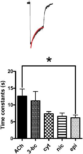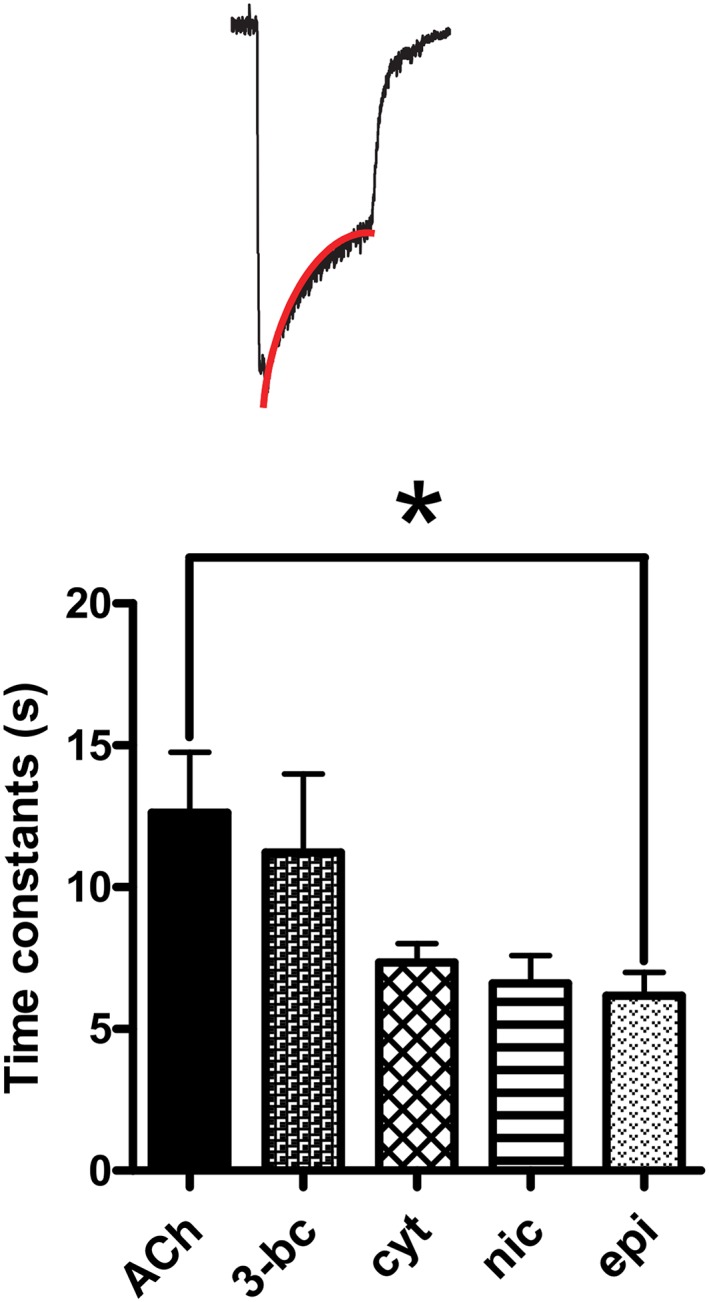 Asu‐ACR‐16 desensitization rate constant fit. Bar chart (mean ± SEM) showing Asu‐ACR‐16 desensitization in response to ACh, 3‐bromocytisine (3‐bc), cytisine (cyt), nicotine (nic) and epibatidine (epi). The rank order for Asu‐ACR‐16 time constants of desensitization was as follows: 100 μM ACh (12.6 ± 2.1 s, n = 6) ~ 100 μM 3‐bc (11.2 ± 2.8 s, n = 6) ~ 100 μM cyt (7.3 ± 0.7 s, n = 6) ~ 100 μM nic (6.6 ± 1.0 s, n = 4) ~ 100 μM epi (6.2 ± 0.8 s, n = 6). Insert: Sample trace with red line signifying desensitization fit. * P < 0.05; significantly different as indicated; Tukey's multiple comparison tests.