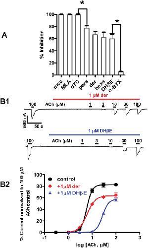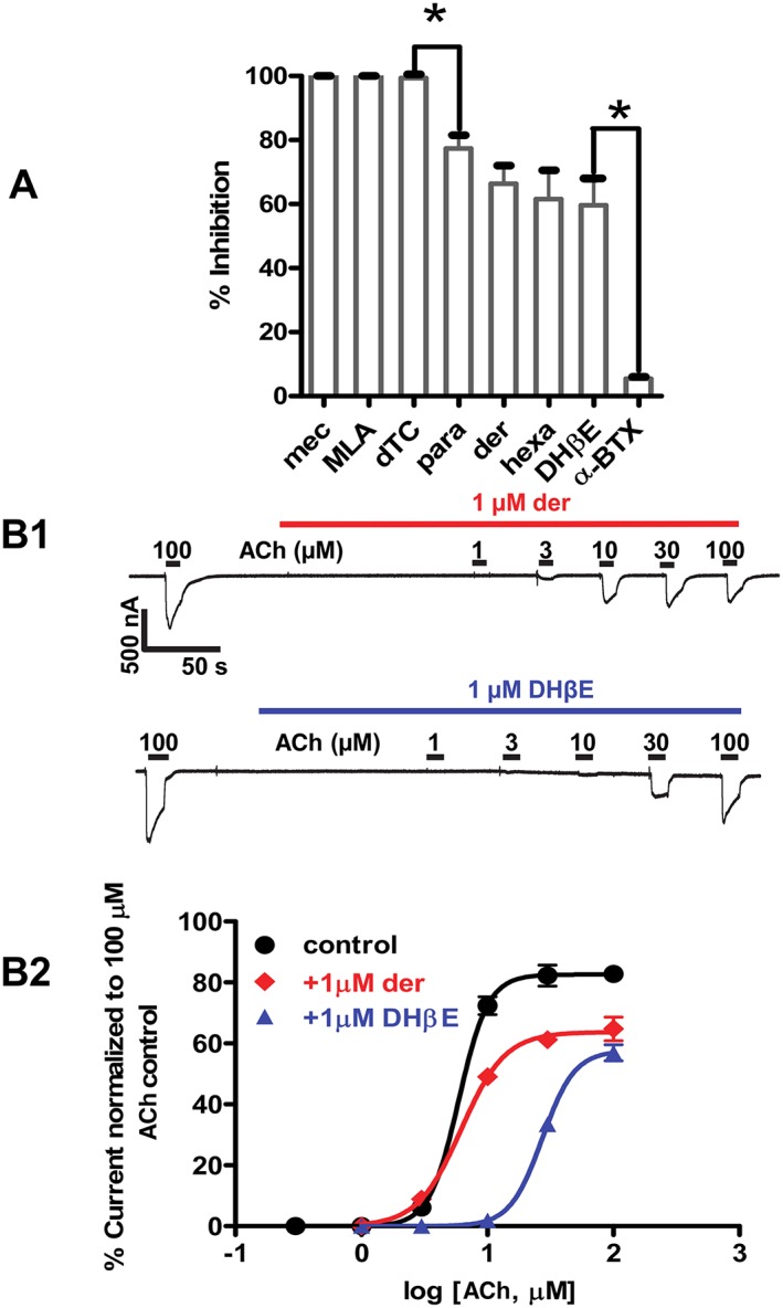 Figure 7. (A) Effects of selected nAChR antagonists on AsuâACRâ16âmediated ACh responses. Bar chart showing effects of selected nAChR antagonists on AsuâACRâ16. Results were expressed as mean ( ± SEM) % inhibition of currents elicited by 100 μM ACh, n = 6, for all antagonists. dTC, mecamylamine (mec) and MLA completely blocked AsuâACRâ16âmediated ACh responses, while paraherquamide (para), derquantel (der), hexamethonium (hexa) and DHβE only produced a partial block of AsuâACRâ16âmediated ACh responses and αâBTX produced an almost insignificant block of AsuâACRâ16âmediated ACh responses. Rank order potency series for the nAChR antagonists each tested at a concentration of 10 μM was as follows: mecamylamine (n = 6) = MLA (n = 6) â dTC (n = 6) > paraherquamide (n = 6) ~ derquantel (n = 6) ~ hexamethonium (hexa) (n = 6) ~ DHβE (n = 6) > αâBTX (n = 6). * P < 0.05; significantly different as indicated; Tukey's multiple comparison tests. We used ANOVA and Bartlett's test for variance inhomogeneity and found no significant difference and Tukey's multiple comparison tests. (B) Doseâresponse relationships for AsuâACRâ16 in the presence of antagonists. (B1) Sample traces for ACh concentrationâresponse relationships for AsuâACRâ16 in the presence of 1 μM derquantel and 1 μM DHβE. (B2) ACh concentrationâresponse plots for AsuâACRâ16 in the presence of 1 μM derquantel and 1 μM DHβE. Derquantel caused a reduction in the maximum response, but no change in EC50, whereas DHβE caused both a reduction in the maximum response and a right shift in the EC50.
