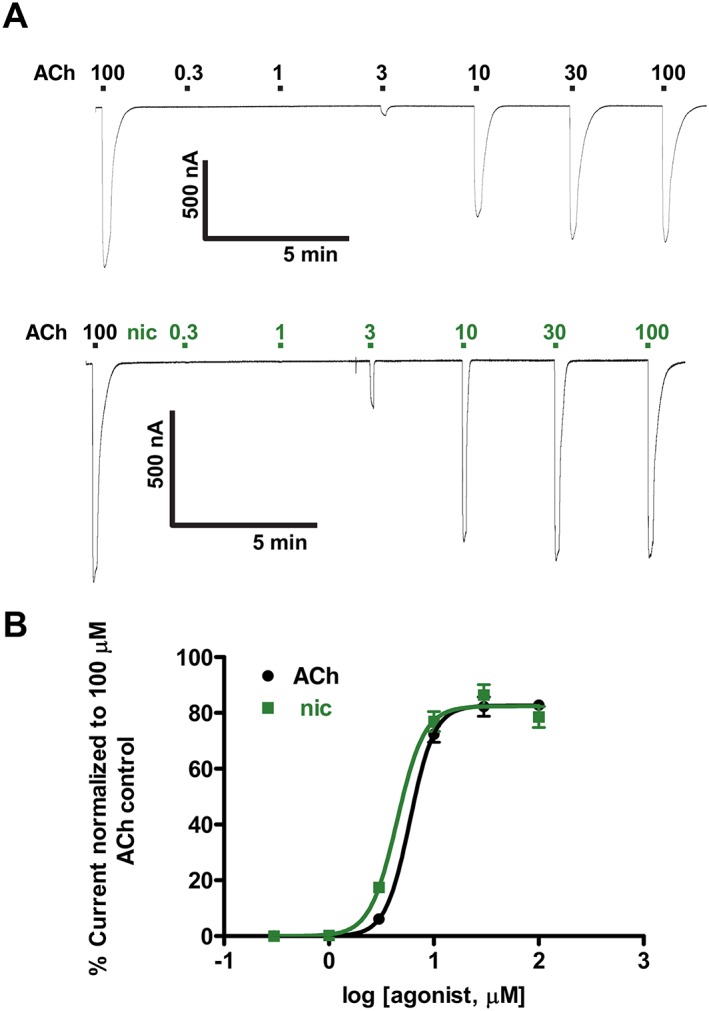 Figure 6. Nicotine (nic) and ACh concentration–response relationships for Asu‐ACR‐16 in the absence of antagonists. (A) Sample traces for ACh (top trace) and nicotine (lower trace) dose–response relationships for Asu‐ACR‐16. (B) ACh and nic dose–response curves for Asu‐ACR‐16. EC50 values (mean ± SEM, μM) were 5.9 ± 0.1 for ACh, Hill slope (n