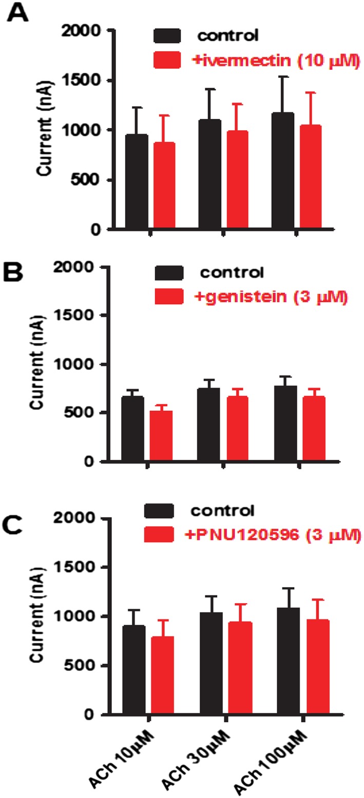 Figure 8. Effects of PAMs of human‐α7 on Asu‐ACR‐16‐mediated ACh responses. Bar charts showing blocking actions of human‐α7 PAMs; (A) 10 μM ivermectin (n = 6), (B) 3 μM genistein (n = 6) and (C) 3 μM PNU120596 (n = 6), on the responses of Asu‐ACR‐16 to ACh. The type 1 PAMs, ivermectin and genistein, as well as the type 2 PAM, PNU120596, caused a reduction in Asu‐ACR‐16 responses to 10, 30 and 100 μM ACh, with the reduction being more pronounced at 10 than at 30 or 100 μM ACh.