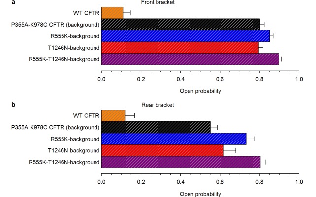 Figure 1—figure supplement 2. High ATP-dependent Po due to background mutation facilitates counting channels.(a–b), Open probabilities in 2 mM ATP, following PKA removal, for WT CFTR and for the four constructs that form the mutant cycle. Po was estimated from the last ~2-minutes of the 2.5-minute segments of recording in 2 mM ATP, bracketing the 5-minute ATP-free period during which spontaneous activity was sampled (n = 6–17). (a) Front bracket, (b) rear bracket (see Figure 2a–d).DOI:
