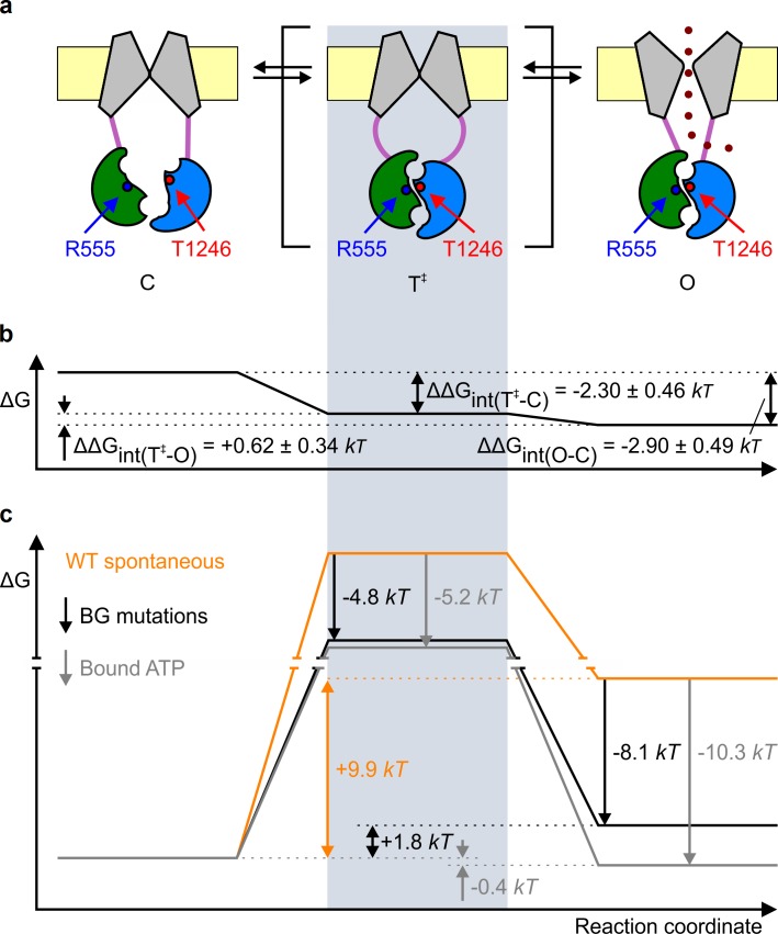 Figure 3. Mechanism of spontaneous pore openings, and energetic effects of bound ATP and gain-of-function mutations.(a) Cartoon representation of domain organization in closed (C), transition (T‡), and open (O) states, during spontaneous gating. Color coding as in Figure 1b, blue and red circles identify target positions. (b) Changes in energetic coupling between the target positions associated with spontaneous gating in the background construct. (c) Free energy profiles of gating for WT (orange line) and P355A-K978C (black line) CFTR in the absence of ATP, and of hydrolysis-deficient K1250R CFTR in saturating ATP (gray line) (Vergani et al., 2005). Black and gray downward arrows illustrate the energetic effects of the background double mutation and of the presence of ATP bound in both composite sites.DOI: