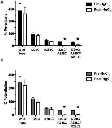 Figure 1. Effect of crosslinking on alcohol/anesthetic responses in TM1-3 mutants. Potentiation of EC5−10 glycine responses by 22 mM butanol (A) or 0.6 mM isoflurane (B) before and after application of the crosslinking agent HgCl2. HgCl2 (10 μM) was applied to wild-type, single mutants, and I229C/A288C and I229C/A288C/C290S mutants in the presence of 100 mM glycine (i.e., the activated/desensitized state). Values represent mean ± SEM from 4 to 5 oocytes. Repeated measures t-tests were used to test differences between pre-and post-HgCl2 conditions (*P < 0.05 compared to the pre-HgCl2 condition for each receptor).