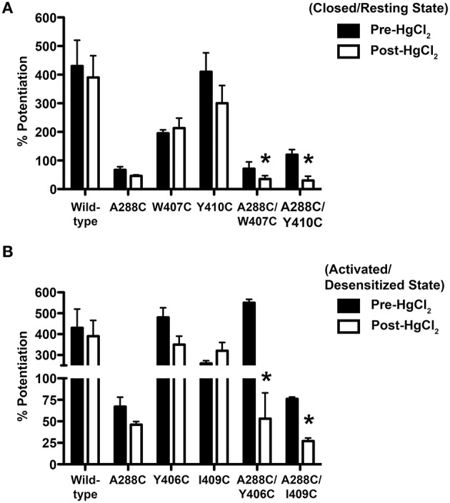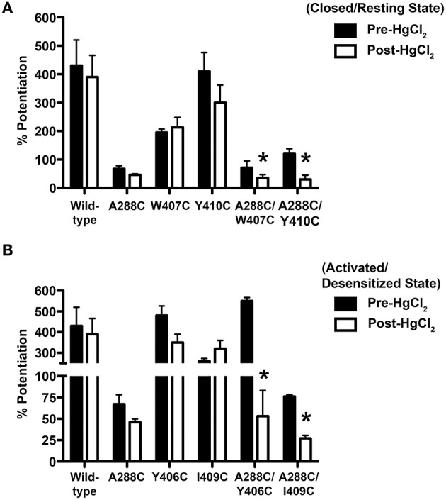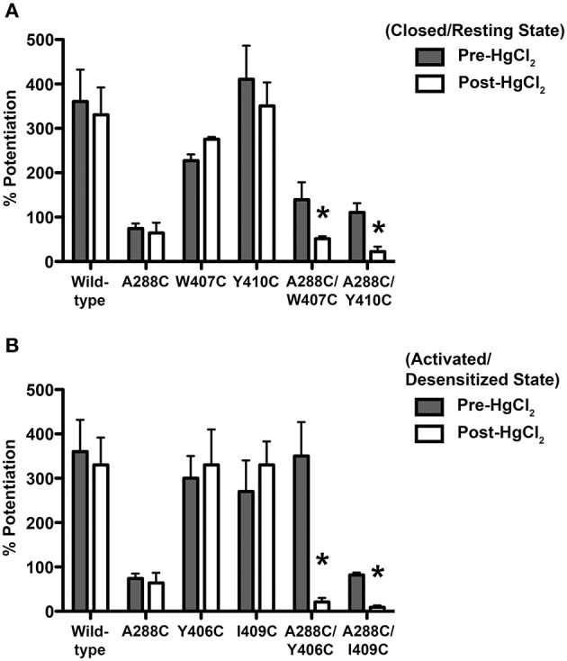 Figure 4. Effect of crosslinking on anesthetic responses in TM3-4 mutants. Potentiation of EC5−10 glycine responses by 0.6 mM isoflurane before and after HgCl2. (A) HgCl2 (10 μM) was applied to wild-type, double (A288C/W407C, A288C/Y410C), and single mutants in the absence of glycine (closed state). (B) HgCl2 (10 μM) was applied to wild-type, double (A288C/Y406C, A288C/I409C), and single mutants in the presence of 100 mM glycine (activated/desensitized state). Values represent mean ± SEM from 4 to 5 oocytes. Data from wild-type and A288C receptors were combined across experiments and are represented in (A,B) and Figure 1B. Repeated measures t-tests were used to detect differences between the pre-and post-HgCl2 conditions (*P < 0.05 compared to the pre-HgCl2 condition for each receptor).