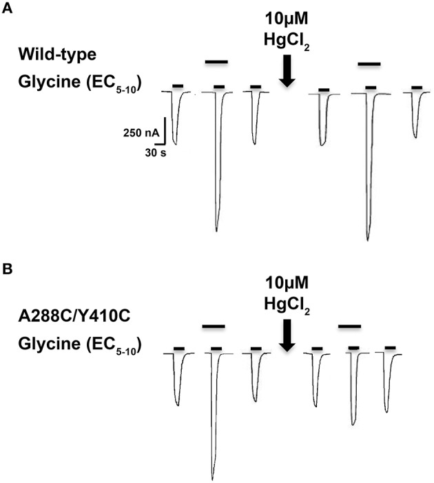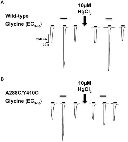 Figure 3. Effect of crosslinking on alcohol responses in TM3-4 mutants. Tracings showing the effect of 22 mM butanol before and after application of 10 μM HgCl2 on EC5−10 glycine-induced currents in individual oocytes expressing wild-type (A) or A288C/Y410C (B) GlyRs. The upper bars indicate butanol pre-application.