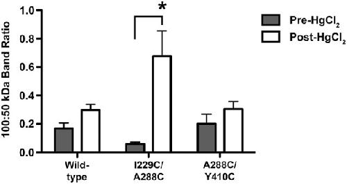 Figure 6. Semiquantitative analysis of dimeric/monomeric band ratios resulting from uncrosslinked and crosslinked GlyRs. Crosslinking was obtained by applying 0.5% H2O2 by bath perfusion. Equal amounts of protein were extracted from oocytes, resolved by SDS-PAGE under non-reducing conditions, and transferred to a membrane where a GlyR alpha 1 antibody was used. Immunoblot images were processed using ImageJ64 software, and GLRA1-labeled band intensity was obtained for 50 and 100 kDa bands, which correspond to monomeric and dimeric GlyR subunits, respectively. Band intensities are reported as direct ratios (100:50 kDa). Immunoblot image analysis revealed a significant increase in the 100:50 kDa band ratio for the I229/A288C (TM1-3) double mutant after crosslinking, but not in the uncrosslinked mutant or in the corresponding wild-type samples. Conversely, no differences in the 100:50 kDa band ratios were detected between uncrosslinked (pre-H2O2) and crosslinked (post-H2O2) conditions for the A288C/Y410C (TM3-4) double mutant or in the corresponding wild-type samples. Statistically significant differences in band ratios between the pre-H2O2 and post-H2O2 conditions were measured and reported as a ratio (mean ± SEM; t-tests, *P < 0.05).
