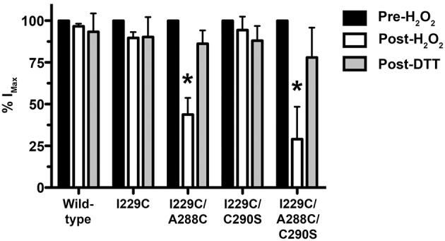 Figure 5. Effect of crosslinking using H2O2 on maximal glycine responses in TM1-3 mutants. The oxidizing agent, H2O2 (0.5%), was applied in the presence of 100 mM glycine for 1 minute followed by a 15-min washout. The response to glycine was measured and then the reducing agent dithiothreitol (DTT, 10 mM) was applied for 3 min followed by a 15-min washout. Values represent mean ± SEM from 3 to 6 oocytes (one-way ANOVA with Tukey's post-hoc test, *P < 0.05).