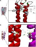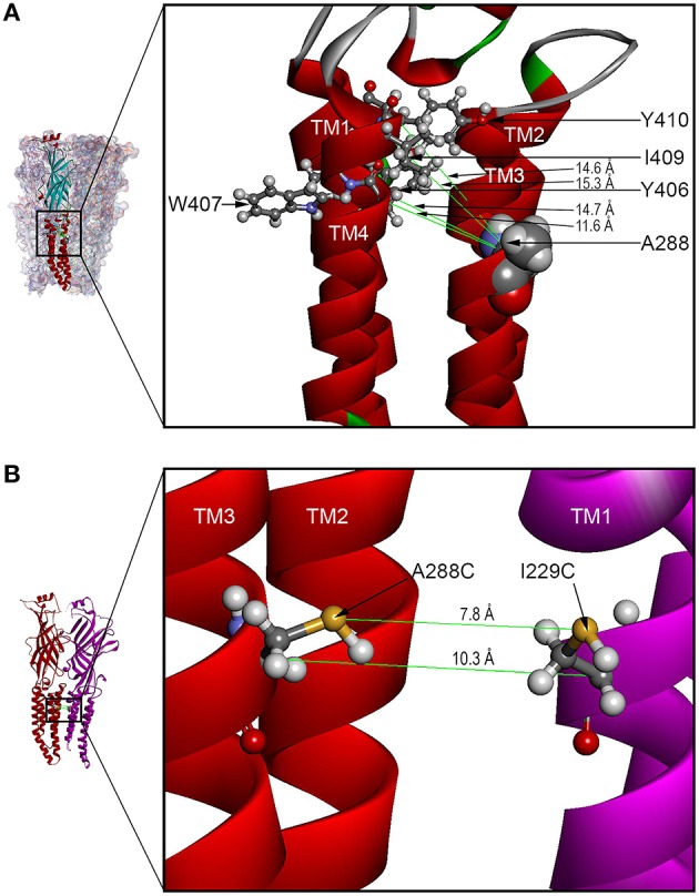 Figure 7. GLRA1 homology models based on GluCl showing TM3-4 intra-subunit and TM1-3 inter-subunit distances. (A) The enlarged boxed area of a GLRA1 subunit shows distances between the C-alpha atoms of cysteines substituted at A288 (TM3) and Y406, W407, I409, and Y410 (TM4) within the same subunit were 14.7, 11.6, 15.3, and 14.6 Å, respectively. (B) The enlarged boxed area of two GLRA1 subunits shows distances between the C-alpha and S-S atoms of adjacent subunits (rendered as backbone ribbons in red and purple) were 10.3 and 7.8 Å, respectively.