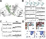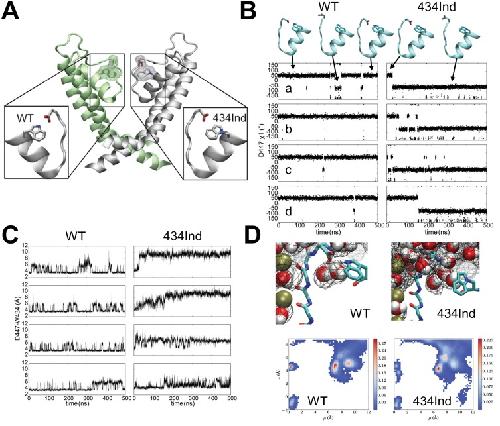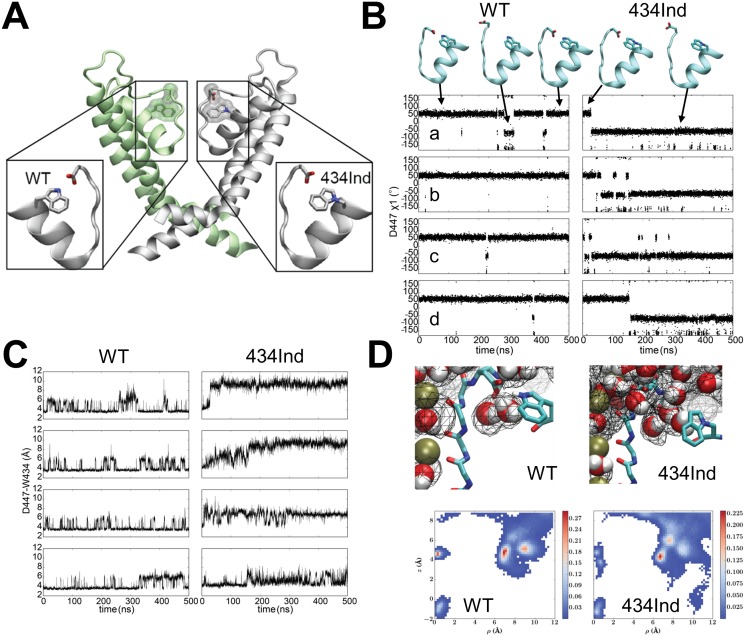 Figure 1. Conformational dynamics of wild type and Trp434Ind Shaker channel.(A) Position of the Trp434 –Asp447 H-bond. (B) Time series of dihedral angles χ1 (N–Cα–Cβ–Cγ) of Arp447 for wild type (left) and Trp434Ind (right) demonstrating the flipping of the Arp447 side-chains during the simulations. (C) Time series of distance between Asp447 and Trp434 in four subunits characterizing the local conformational dynamics during equilibrium simulations for wild type (left) and Trp434Ind (right) of Shaker. The distance is measured between Asp447 (Cγ) and Trp434 (Nε1) or equivalent atom in the same position in Trp434Ind. (D) Top panels, typical conformations for protein and water molecules and occupancy (20%) map of water molecules around selectivity filter of subunit C. Bottom panels, 2D average occupancy map for all four subunits during 500ns MD simulations. The x-axis describes the radius to the center of the selectivity filter, and the y-axis is the z-coordinate of water molecules. In all simulations the selectivity filter in the conductive state. Videos 1 and 2 indicate 150 ns vignettes of the simulation for the W434-D447 and W434Ind-D447 in the presence shown water molecules. In each case, a subunit of Shaker (residues 433 to 447) is shown in new-cartoon representation, and side chains of W434 and D447 are shown in sticks, and water molecules are in VDW representations.DOI: