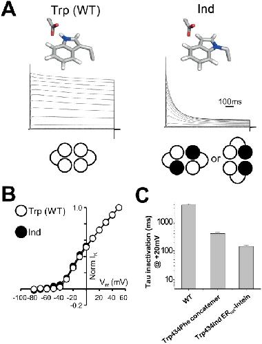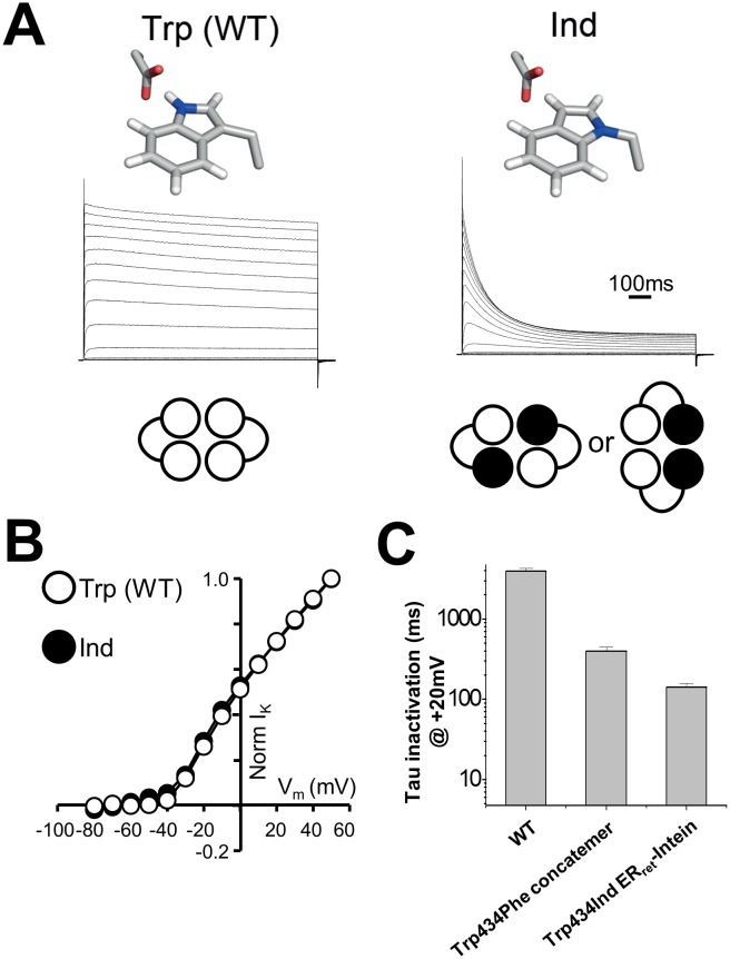 Figure 3. Use of ERret-intein tagged Shaker monomers allow for stoichiometric expression of Ind.(A) Normalized representative currents for Trp434Trp (WT) (left) and Trp434Ind (right). A schematic of the stoichiometry of the incorporated amino acids Trp (white) and Ind (black) is shown below the traces. (B) Average voltage dependence of normalized currents for Trp434Trp (WT) (open circles; n = 5) and Trp434Ind (filled circles, n = 9). (C) Average inactivation rates at +20 mV of WT Shaker, Trp434Phe (first monomer) four monomer concatemer, and Trp434Ind ERret-intein constructs.DOI: