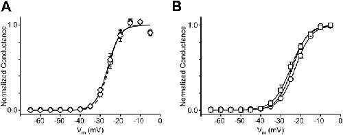 http://dx.doi.org/10.7554/eLife.18976.010Figure 5âfigure supplement 1. Voltage dependence of Nav1.4 activation is unaltered by engineered split inteins.(A) Conductance-Voltage relationships of full-length WT Nav1.4 (solid line, circles) and front half WT Nav1.4 I-II N-intein + back half WT Nav1.4 III-IV C-intein (dashed line, diamonds). (B) Conductance-Voltage relationships of Nav1.4 I-II N-intein Y401TAG + Nav1.4 III-IV C-intein WT + tRNA(Phe) (circles), Nav1.4 I-II N-intein WT + Nav1.4 III-IV C-intein Phe1304TAG + tRNA(Phe) (triangles) and Nav1.4 I-II N-intein Tyr401TAG + Nav1.4 III-IV C-intein Phe1304TAG + tRNA(Phe) (squares).DOI: