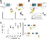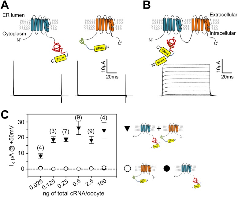 Figure 2. Attachment of ER retention/retrieval motifs paired with split inteins results in co-dependent surface membrane expression of Shaker channels.(A) Expression of either Shaker channel with C-terminal appended Kir6.2 ER retention/retrieval motif (ERret; yellow) with N-intein (red) (A, left) or Shaker channel with N-terminal appended Kir6.2 ER retention/retrieval motif (yellow) with C-intein (green) (A, right), resulted in negligible ionic current (A, lower panels).Representative currents in lower panel A, are raw capacitance and ionic currents that are blanked above and below 25 and −5µA, respectively. P/4 subtracted currents are shown in lower panel B to display normal channel kinetics observed following expression of engineered ERret-intein Shaker channels. See Materials and methods for ER-retention/retrieval and intein sequences. (B) Co-expression of Shaker N- and C-terminal ERret-intein channels resulted in surface membrane trafficking of Shaker channels and robust ionic current (lower panel) measured by TEVC. (C) Injection of increased amounts of C-terminal (filled circles) or N-terminal (open circles) ERret-intein-tagged Shaker cRNA resulted in insignificant surface expression of Shaker channels as measured with TEVC. Co-injection of increased amounts of N- and C-terminal ERret-intein cRNA resulted in saturated ionic current (filled triangles). Number of observations where two Shaker monomers are expressed are indicated in parentheses above symbols. Average values where only one Shaker monomer was expressed were composed of 2–10 observations.DOI: