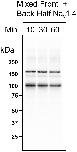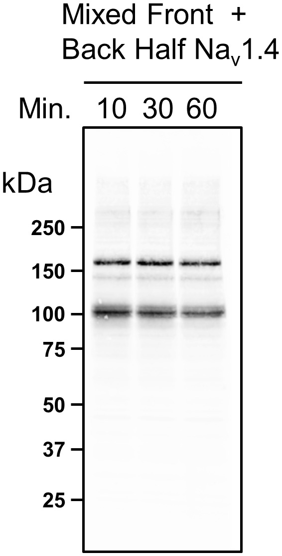 http://dx.doi.org/10.7554/eLife.18976.008Figure 4—figure supplement 1. Assembly of split-intein Nav1.4 constructs occurs within the cells.HEK293 cell lysates expressing either front half WT Nav1.4 I-II N-intein and back half WT Nav1.4 III-IV C-intein were mixed on ice for 10, 30 and 60 min and separated by acrylamide gels, transferred and immunoblotted. No higher order band was detected following incubation of split-intein constructs following cell-lysis indicating that assembly and intein-dependent peptide bond formation occurred within the cell.DOI: