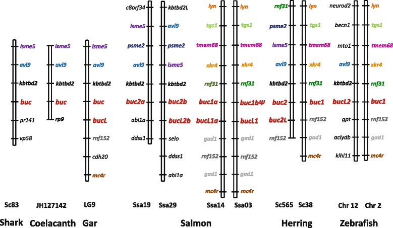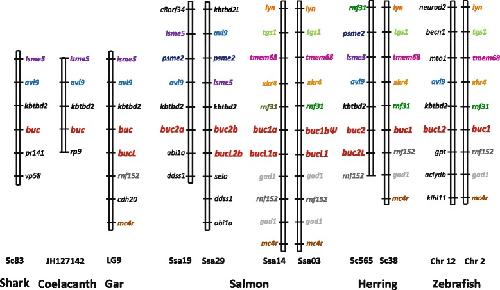 Fig. 1. Conserved synteni of buc and neighbor genes in various fish species. Spotted gar buc and bucL-(like) genes have been duplicated in teleost fish, but several paralogs are lacking. Conserved syntenic genes are shown in bold, and orthologs are given in same color