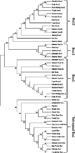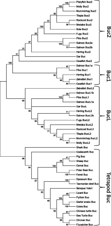 Fig. 2. Unrooted phylogenetic tree of tetrapod Buc proteins and teleost Buc and BucL (−like) paralogs. The tree was generated using the ML method based on the JTT model. To evaluate the topological stability 100 bootstrap resamplings were made. All branches with less than 30 bootstrap confidence values were collapsed. Accession numbers are given in Additional file 3: Table S1