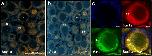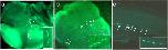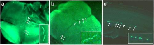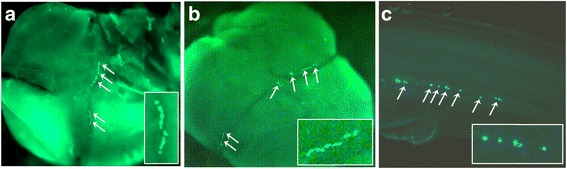 Fig. 4. Salmon embryo at 4-cell stage with fluorescent signals in cleavage furrows from: a Immunostained endogenous Buc1a protein, b Zebrafish Buc-GFP injected in 1-cell salmon embryos. Magnified signals are shown in the white box. c Zebrafish Buc-GFP localized to putative PGCs in salmon embryos during segmentation. White arrows indicate fluorescent signals. Immunostained salmon embryo with secondary antibody only is shown in Additional file 8: Figure S5