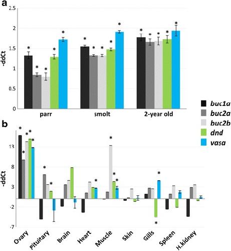 Fig. 5. Gene expression of salmon buc1, buc2a, buc2b, dnd and vasa. a Ovarian mRNA levels during oogenesis at the freshwater (parr) and early seawater (smolt) stages compared to those in 3-year old ovary (n = 6). b Tissue expression in 2-year old females (n = 2). All tissues were compared to liver. The transcriptional levels of target genes were normalized to eEf1-a. Data are presented as –ΔΔCt ± SE. Significant difference is marked with * (p < 0.05)