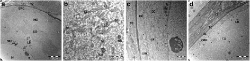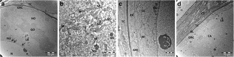 Fig. 8. Ultrastructure of Atlantic salmon oocytes. a Stage 2 oocytes with granular ooplasm/Balbiani body. Black arrows indicate accumulations of nuage close to nuclear envelope and numerous nucleoli. b An area with aggregates of nuage and numerous mitochondria. c Ooplasm of stage 2 oocytes with endoplasmic reticulum and Golgi complex near the nuclear membrane. d Stage 4 oocyte surrounded with follicular cells. BL-basal membrane; CA-cortical alveoli; CT-connective tissue; ER-endoplasmic reticulum; GC-Golgi complex; GO-granular ooplasm; GRC-granulosa cell; HO- homogeneous ooplasm; LB-lipid body; M-mitochondria; NU-nuage; N-nucleus; n-nucleolus; TC-theca cell