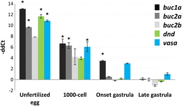 Fig. 3. mRNA levels of salmon buc1a, buc2a and buc2b together with dnd and vasa during embryogenesis. The transcriptional levels of target genes were normalized to eEf1-a and presented as -ΔΔCt ± SE (n = 3). All stages were compared to the segmentation stage that follows late gastrulation. Significant difference is marked with * (p < 0.05)