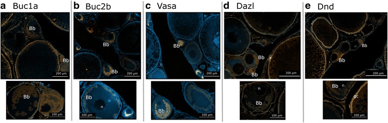 Fig. 6. Immunohistochemical staining of ovarian sections from maturing 2-year old salmon. a Buc1a restricted to granular ooplasm of immature oocytes with magnified section below showing immature oocytes positively stained for Buc1a (orange). b Buc2a in ooplasm of immature oocytes with magnified view of Buc2b positive oocytes (orange) below. c Vasa positive signals (orange) in immature oocytes with magnified view below. d Dazl signals (orange) in Bb and nucleoli of immature oocytes and granulosa cells of more mature follicles with magnified oocyte positively stained for Dazl. e Population of oocytes at different developmental stages showing Dnd signals (orange) in both immature and cortical alveolus stage oocytes. Magnified view of Dnd signals is shown below. Proteins are stained orange and nuclei are stained blue with DAPI. Ovaries used to prepare the sections were collected from 3 different females. Bb- Balbiani body, gc- granulosa cell, n- nucleolus. Negative (secondary antibody alone) and positive (collagen staining) controls are shown in Additional file 8: Figure S5
