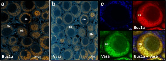 Fig. 7. Immunohistochemical staining of juvenile ovarian sections. Adjacent sections were used for staining of (a) Buc1a (orange) and (b) Vasa (orange). c Co-localization of Buc1a and Vasa in the granular ooplasm of primary growth oocytes. Ovaries used to prepare the sections were collected from 3 different females. Nuclei were stained with DAPI (blue); Bb- Balbiani body, on- oocyte nucleus