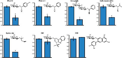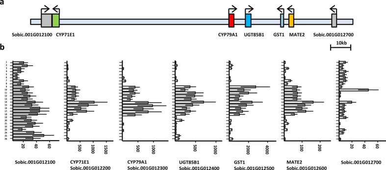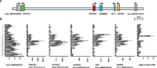 The biosynthetic gene cluster for the cyanogenic glucoside dhurrin in Sorghum bicolor contains its co-expressed vacuolar MATE transporter.