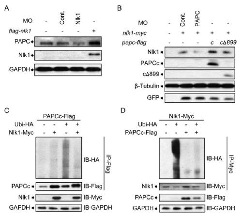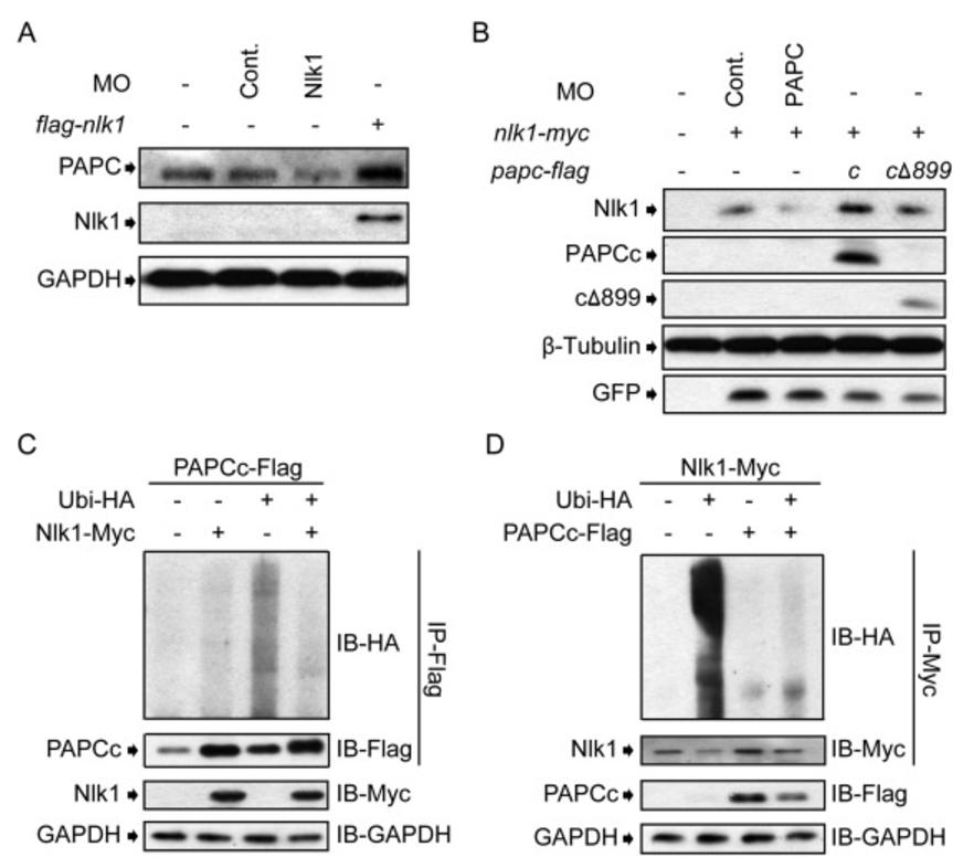 Mutual stabilization of PAPC and Nlk1. A, Immunoblot analysis of endogenous PAPC in Xenopus stage 10 gastrula embryos, following injection with the indicated MOs (12 ng/embryo) or mRNA (300 pg/embryo). GAPDH was used as loading control. B, Immunoblot analysis of overexpressed Nlk1 in stage 10 gastrula embryos injected with the indicated MOs (12 ng/embryo) and mRNA (300 ng/embryo). β-Tubulin and GFP were used as loading and injection controls, respectively. Proteins were detected using antibodies against the respective tag. CâD, Ubiquitination assay in HEK293 cells. Ubiquitin-HA (Ubi-HA) and (C) PAPCc-Flag or (D) Nlk1-Myc were co-expressed, and proteins were precipitated by anti-Flag (C) or anti-Myc (D) IP. Ubiquitination was detected by blotting with anti-HA antibody. GAPDH was used as loading control.