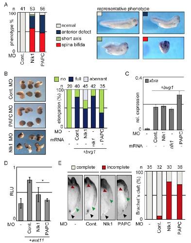 Nlk1 and PAPC regulate gastrulation movements, Wnt/PCP signaling, and tissue separation in Xenopus embryos. A, Quantification of gastrulation defects in stage 35 Xenopus embryos injected dorsal-equatorially with indicated MOs (15 ng/embryo). Representative phenotypes are shown on the right. B, Representative images and quantification of elongation of AC explants from embryos injected animally at four-cell stage with indicated MOs (15 ng/embryo) and synthetic mRNA (bvg1: 100 pg/embryo, nlk1: 300 pg/embryo). ACs were excised at stage 8â9 and samples were scored after 14 h. C, qPCR analysis of xbra from the samples in B, normalized to the housekeeping gene odc (ornithine decarboxylase). Error bars represent standard deviation of triplicate, experiments repeated twice and with comparable results. D, ATF2 luciferase reporter assay in stage 12 embryos injected at the eight-cell stage animal-dorsally with indicated MOs (12 ng/embryo) and wnt11 mRNA (250 pg/embryo). The graph shows the mean±SD of three independent experiments (* p<0.05 compared with Wnt11 induced control). RLU: relative light units. E, Analysis of Brachet's cleft formation in sagittally sectioned stage 11 embryos injected with the indicated MOs (10 ng/embryo). Categorization of the cleft for quantification in the graph on the right is shown on top of the representative images. The blastopore (posterior) is marked by black arrowheads, red and green arrowheads indicate the anterior and posterior end of the Brachet´s cleft, respectively.