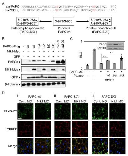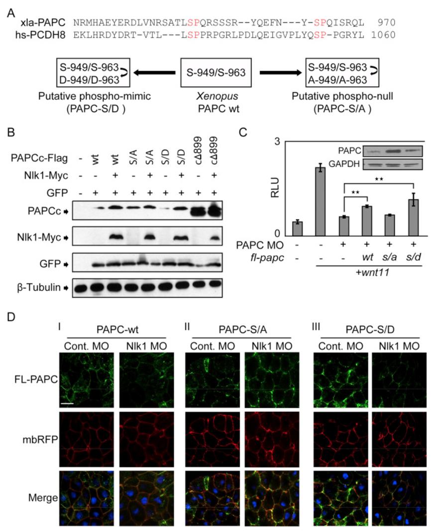 PAPC Ser949/963 residues control protein stability and function. A, Partial sequence alignment of Xenopus laevis PAPC and human PCDH8. Conserved serine motifs at positions 949 and 963 are highlighted in red. The scheme below shows the mutant constructs in which both serines were replaced with either glutamate (S/D) or alanine (S/A). B, Immunoblot analysis of the mutated PAPCc constructs in HEK293 cells, following co-transfection with Nlk1. GFP and β-Tubulin were used as transfection and loading controls, respectively. C, ATF2 luciferase reporter assay in stage 12 Xenopus embryos injected with indicated MOs (12 ng/embryo) and mRNA (300 pg/embryo, wnt11 250 pg/embryo). The graph shows the mean±SD of three independent experiments (** p<0.01 compared with wnt11+PAPC MO injected samples). Inset: Expression analysis of PAPC constructs by immunoblotting. RLU: relative light units. D, Immunofluorescence microscopy of AC explants injected animally at the four-cell stage with mRNA for papc (I), papc-s/a (II), papc-s/d (III), or mbRFP (300 pg/embryo), and MOs (12 ng/embryo). PAPC constructs are shown in green and the plasma membrane by mbRFP in red. Nuclei were counterstained with DAPI (blue). Scale bar: 50 µm.