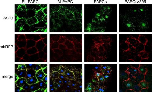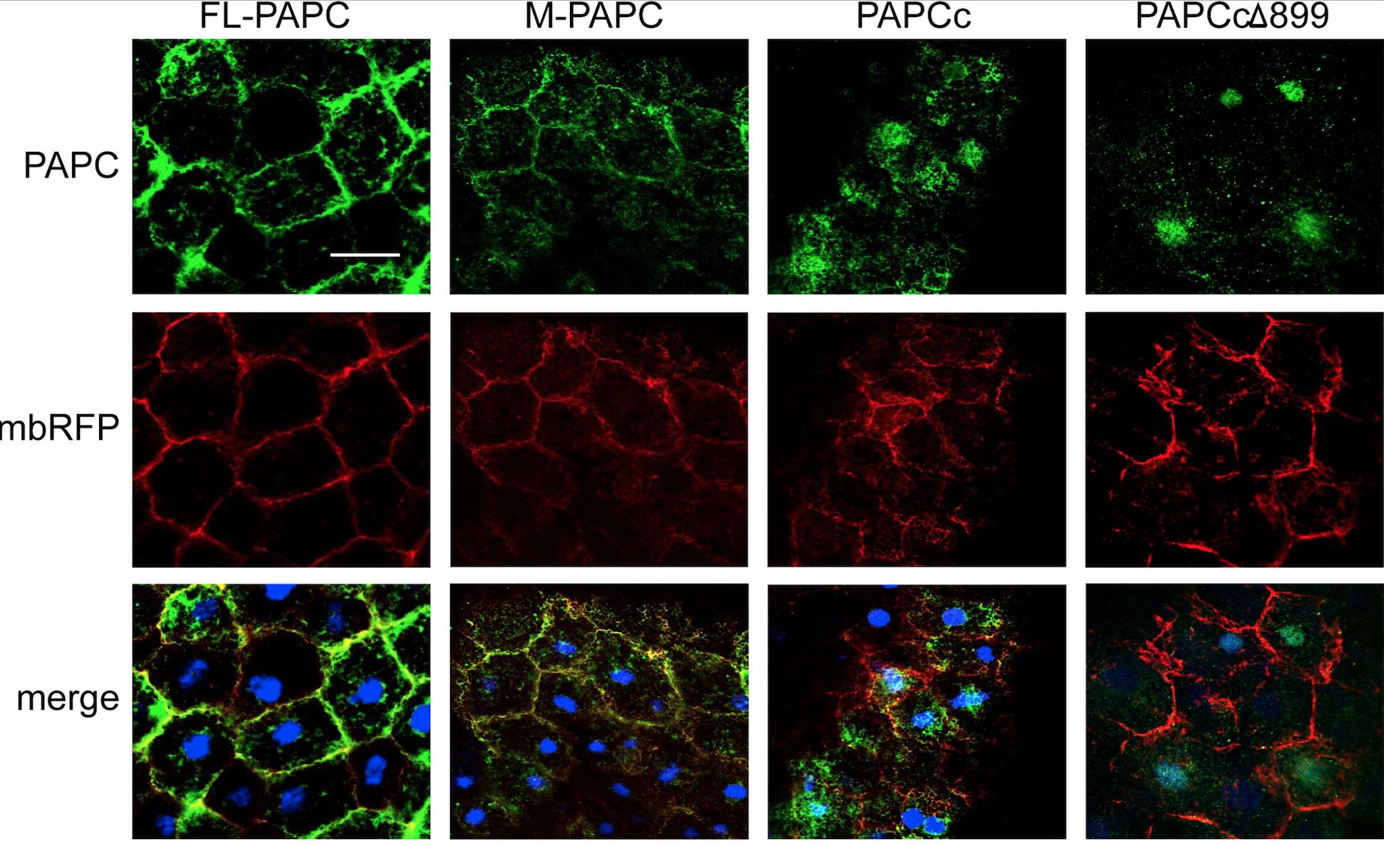 Subcellular localization of FL-PAPC and its deletion constructs. Embryos were injected animally at the four-cell stage with 300 pg/embryo papc and mbRFP control constructs (red). Nuclei were counterstained with DAPI (blue). Scale bar=50 µm. White arrowheads indicate co-localization at the plasma membrane and the asterisk marks expression of both proteins inside the nucleus.