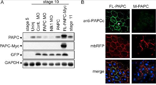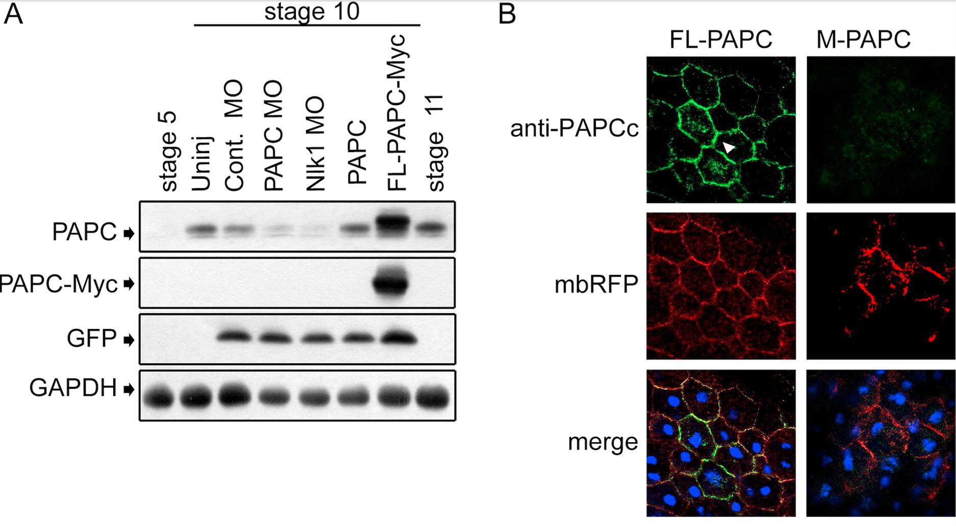 Validation of the custom-made anti-PAPCc antibody. A, Immunoblot analysis of embryo lysates from indicated developmental stages, and stage 10 gastrula embryo lysates injected with the indicated MOs (12 ng/embryo) or mRNAs (300 pg/embryo). Overexpression of PAPC-Myc was confirmed using an anti-Myc antibody. GFP and GAPDH were used as injection and loading controls, respectively. B, Immunofluorescence staining of AC explants overexpressing PAPC or M-PAPC (300 pg mRNA/embryo). PAPC was detected using the custom anti-PAPCc antibody (green). Arrowhead shows PAPC protein at the membrane visualized by co-injection of mbRFP (red). DAPI (blue) was used for nuclear staining. Scale bar=50 µm.