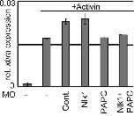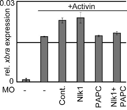 Mesoderm induction was normal in the morphants. Analysis of xbra expression by qPCR in the sibling AC explants from Fig. 4C normalized to the housekeeping gene odc. Error bars represent the standard deviation for representative triplicate experiments repeated twice with comparable results.