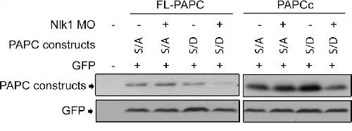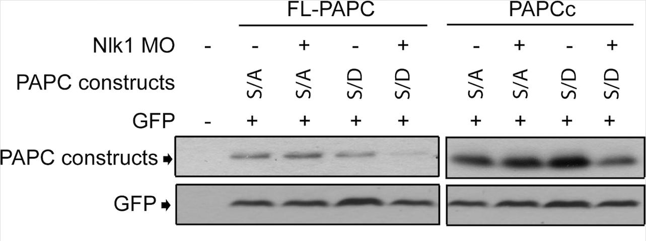 PAPC mutants are sensitive to the loss of Nlk1. Immunoblot analysis of lysates from stage 10 embryos overexpressing PAPC phospho-mutants (both full length and PAPCc) injected with the indicated MOs (12 ng/embryo). GFP was used as an injection controls. Proteins were detected using an antibody against the respective tag and GFP.