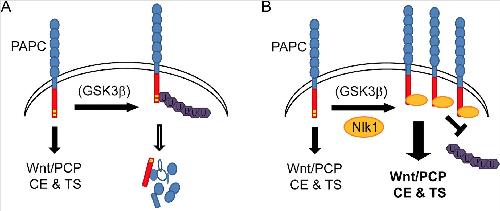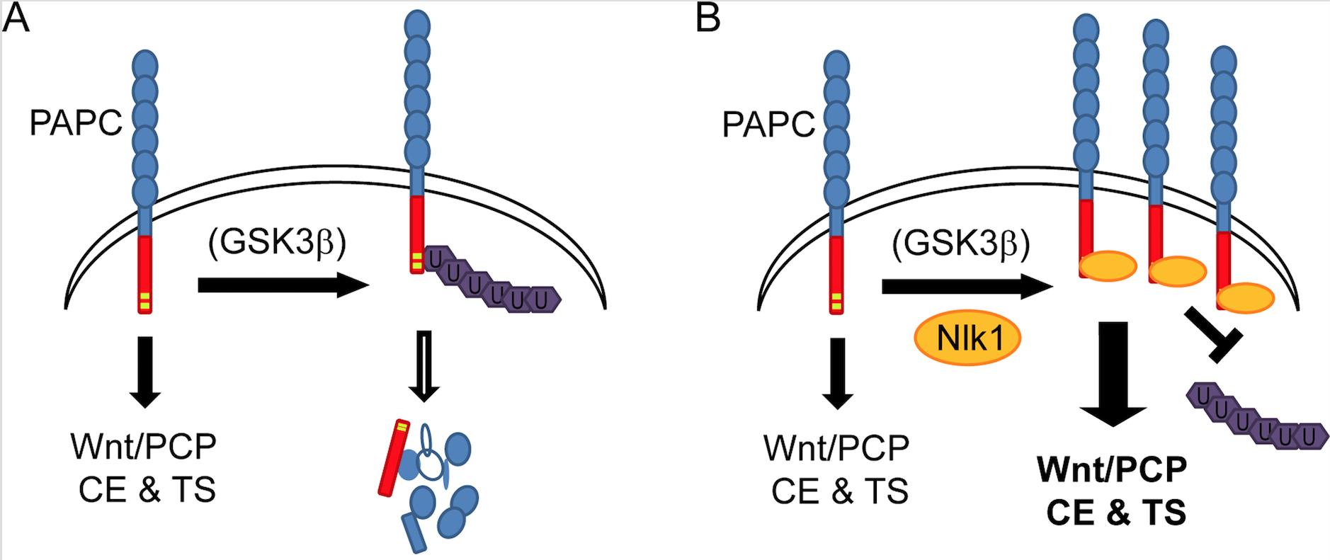 Model for the proposed function of the Nlk1-PAPC interaction. A, When PAPC (transmembrane and extracelluar domains in blue) is expressed without Nlk1 its putative phosphorylation sites (S949/S963, green dashes) at the C-terminus (red) are unprotected and it can be targeted for polyubiquitination (violet hexagons) â probably by GSK3β â and subsequently degraded. PAPC molecules that escape degradation regulate Wnt/PCP signaling, convergent extension (CE) movement and tissue separation (TS). B, When Nlk1 (yellow ellipse) is co-expressed, it binds to the C-terminal domain of PAPC and probably protects the phosphorylation sites. This prevents polyubiquitination and leads to stabilization of PAPC proteins at the membrane, promoting its function during gastrulation.