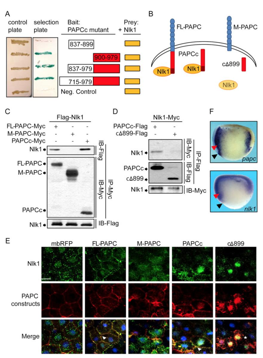 Nlk1 and PAPC interact with each other. A, Yeast two-hybrid screen to investigate PAPC and Nlk1 interaction. The intracellular domain of PAPC (PAPCc, aa715â979) and the indicated deletion constructs (white and red) were used as bait and Nlk1 (yellow) was used as prey. The interaction of bait and prey was visualized by growth on selection plates and by synthesis of β-galactosidase (blue). The last 80 amino acids of PAPC (aa900-979) are highlighted in red. B, Schematic representation of Xenopus PAPC constructs used in this study. The cytoplasmic domain (PAPCc) is drawn in red and unbound Nlk1 is emphasized by lighter appearance. C, Co-immunoprecipitation (Co-IP) of Nlk1 and PAPC in HEK293 cells. Indicated PAPC constructs were immunoprecipitated using an anti-Myc antibody and subjected to immunoblot analysis using an anti-Flag antibody to detect co-precipitated Nlk1, or anti-Myc to detect PAPC. D, Co-IP of Nlk1 and the PAPC C-terminus in HEK293 cells. PAPCc and cδ899 were precipitated using an anti-Flag antibody, and Nlk1 was detected with anti-Myc antibody. E, Immunofluorescence staining of Nlk1-Myc (green) and the indicated PAPC constructs (red) in Xenopus AC explants. Embryos were injected animally at four-cell stage with 300 pg RNA per construct. Membrane bound RFP (mbRFP) was used as control. Nuclei were counterstained with DAPI (blue). Scale bar: 50 µm. White arrowheads indicate co-localization at the plasma membrane and the asterisk marks the localization of both proteins inside the nucleus. F, papc and nlk1 were detected in Xenopus embryos by whole mount in situ hybridization. Sagittally sectioned gastrula (stage 10.5) embryos were stained with DIG-labelled antisense RNA probes (violet) for nlk1 and papc. Black arrowheads indicate position of the blastopore, while red arrowheads show the involuting mesoderm.