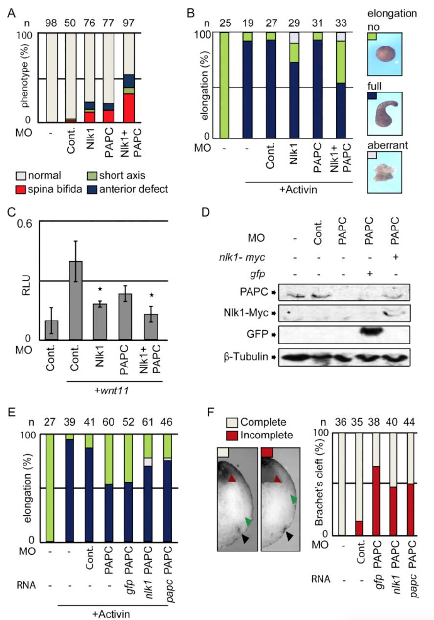 PAPC and Nlk1 function cooperatively during gastrulation regulation. A, Quantification of gastrulation defects in stage 35 Xenopus embryos injected at four-cell stage dorsal-equatorially with the indicated MOs (6 ng/embryo). Total amount of MO injected in each embryo was adjusted to 12 ng/embryo with control (Cont.) MO. B, Quantification and representative images of AC explants from embryos injected animally at the four-cell stage with indicated MOs (5 ng/embryo, total MO amounts adjusted with Cont. MO). ACs were excised at stage 8â9, elongation was induced with 50 ng/ml Activin, and samples were scored after 14 h. C, ATF2 luciferase reporter assay in stage 12 embryos injected at the eight-cell stage animal-dorsally with indicated MOs (5 ng/embryo, total MO amounts adjusted with Cont. MO). The reporter was activated by injection of wnt11 mRNA (250 pg/embryo). The graph shows the mean±SD of three independent experiments (* p<0.05 compared with Wnt11 induced control). RLU: relative light units. D, Immunoblot analysis of endogenous PAPC in gastrula stage Xenopus embryos. Embryos were injected at the four-cell stage with the indicated MOs (10 ng/embryo) and mRNA (300 pg/embryo). β-Tubulin was used as loading control. E, Quantification of AC explants from embryos injected animally at the four-cell stage with indicated MOs (12 ng/embryo) and mRNA (300 pg/embryo). ACs were excised at stage 8â9 and elongation was induced with 50 ng/ml Activin, and samples were scored after 14 h. The legend of the graph is exactly as in B. F, Brachet's cleft formation of sagittally sectioned stage 11 embryos injected with the indicated MOs (12 ng/embryo) and synthetic mRNA (300 pg/embryo). Categorization of the cleft for quantification in the graph on the right is shown at the bottom of the representative images. The blastopore (posterior) is marked by black arrowheads, red and green arrowheads indicate the anterior and posterior end of the Brachet´s cleft, respectively.