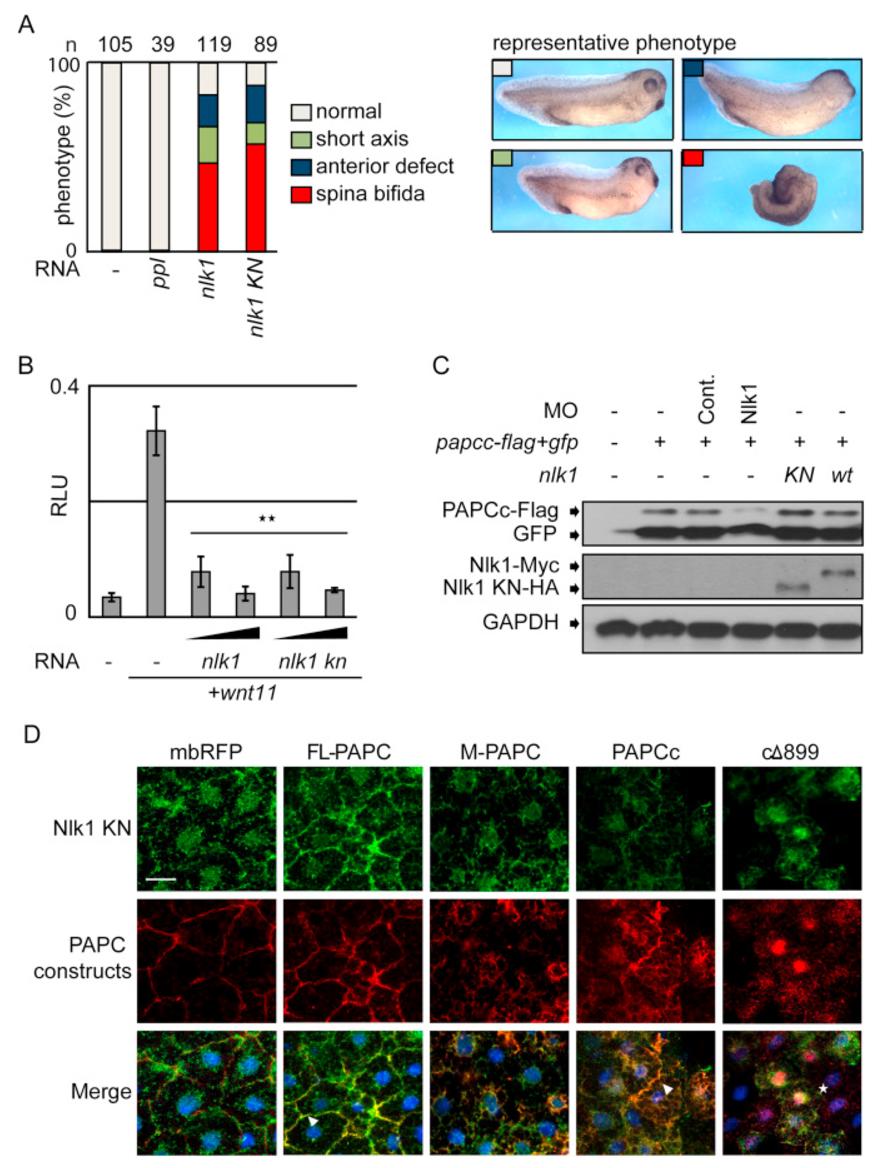 Nlk1 kinase activity is dispensable for gastrulation regulation and PAPC stabilization. A, Quantification of gastrulation defects in stage 35 Xenopus embryos injected dorsal-equatorially with indicated mRNA (250 pg/embryo). Representative phenotypes are shown on the right. B, ATF2 luciferase reporter assay in stage 12 embryos injected with indicated mRNA (wnt11 and lower dose of nlk1 and nlk1 kn: 250 pg/embryo, higher dose: 500 pg/embryo). The graph shows the mean±SD of three independent experiments (** p>0.01 compared with Wnt11 induced control). RLU: relative light units. C, Immunoblot analysis of lysates from stages 10 gastrula embryos injected with the indicated MOs (12 ng/embryo) or mRNA (300 pg/embryo). GFP and GAPDH were used as transfection and loading controls. D, Immunofluorescence microscopy of AC explants. Embryos were injected animally at the four-cell stage with 300 pg/embryo of nlk1 kn-ha (green) and the indicated papc-myc constructs or mbRFP as control (red). Nuclei were counterstained with DAPI (blue). Scale bar=50 µm. White arrowheads indicate co-localization at the plasma membrane and the asterisk marks expression of both proteins inside the nucleus.
