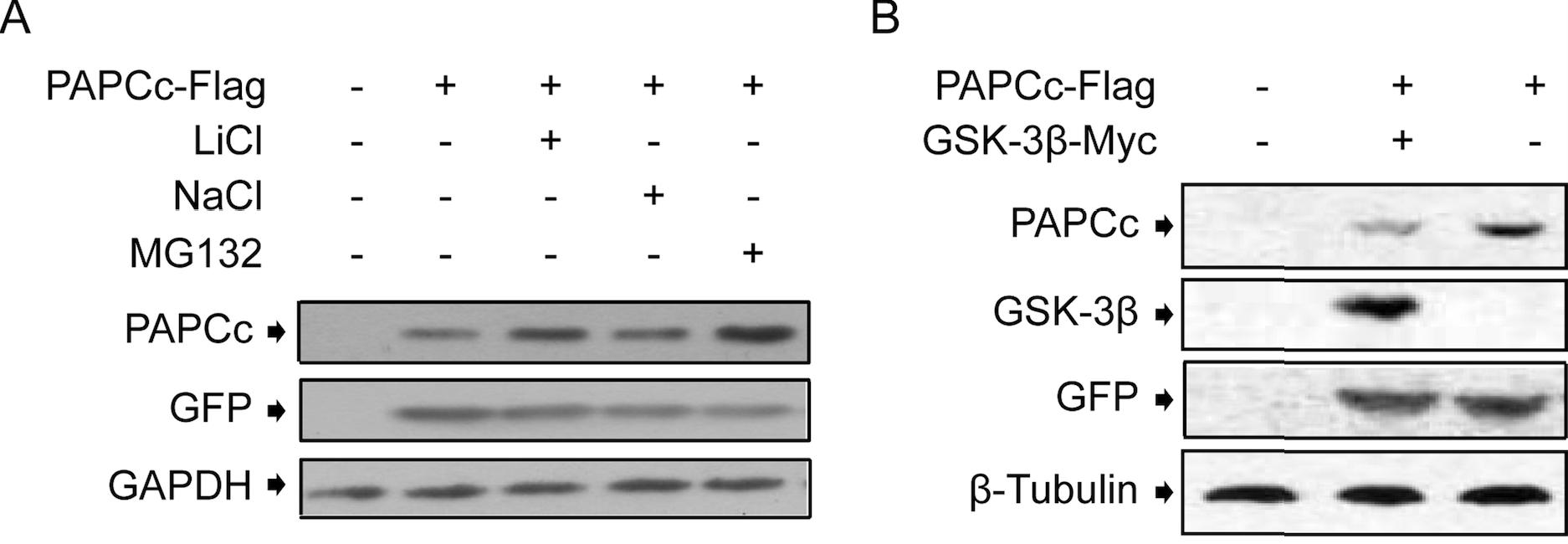 GSK-3β reduced PAPCc protein levels. A, Immunoblot analyses of overexpressed PAPCc in HEK293 cells. Cells were transfected with indicated plasmids and treated with 10 µm MG132 or 10 mM LiCl for 4 h prior to protein extraction. NaCl was used as negative control. GFP and GAPDH were used as transfection and loading controls, respectively. B, Immunoblot analysis of PAPCc levels in HEK293 cells following concomitant overexpression of GSK-3β. GFP and β-Tubulin were used as transfection and loading controls.