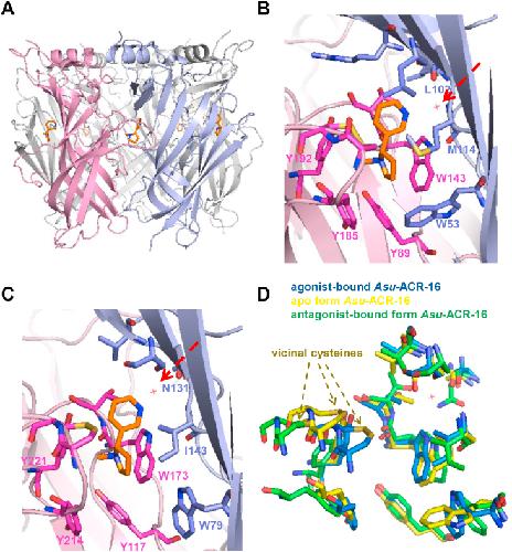 Fig. 1. Crystal structure of Lst-AChBP bound with nicotine (PDB code: 1UW6) and the agonist-bound model of Asu-ACR-16.(A) Ribbon diagram of the AChBP co-crystalized with nicotine, as viewed with membrane at the bottom. The principal subunit is highlighted by light pink and the complement subunit is highlighted by light purple, for clarity. Nicotine (orange) is bound in the five ligand-binding sites in the extracellular domain of AChBP.(B) Close view of the AChBP ligand-binding site. The principal subunit in light pink, the complementary subunit in light purple. Residues interacting with nicotine (orange) are represented as sticks ((+), pink; (−), purple), and water molecule is shown as red dot, view with membrane at the bottom.(C) Close view of the agonist-bound model of Asu-ACR-16 ligand-binding site. The principal subunit in light pink, the complementary subunit in light purple. The interacting residues are represented as sticks ((+), pink; (−), purple), and water molecule is shown as red dot, view with membrane at the bottom. (D) Superposition of residues in agonist-binding site, among agonist-bound form (blue), apo (no ligand) form (yellow), antagonist-bound form (green) of Asu-ACR-16 models are shown. (For interpretation of the references to colour in this figure legend, the reader is referred to the web version of this article.)