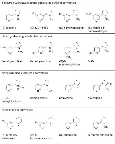Fig. 3. Chemical structures of (S)-nicotine and fifteen derivatives studied. 5-substituted pyridine ring derivatives: (S)—SIB 1508Y, (S)-5-bromonicotine, (S)-nicotine-5-carboxaldehyde and 5-methylnicotine; other pyridine ring substituted derivatives: (S)-1-methylnicotinium, 6-methylnicotine and 5-(1-methyl-pyrrolidin-2-yl)-pyridin-2-ylamine (6-AN); pyrrolidine ring substituted derivatives: (S)-1’-methylnicotinium, homonicotine, nornicotine and (S)-cotinine; piperidine ring derivatives: (S)-5-ethynyl-anabasine, (S)-5-bromoanabasine, (S)-anabasine and N-methyl anabasine are shown.