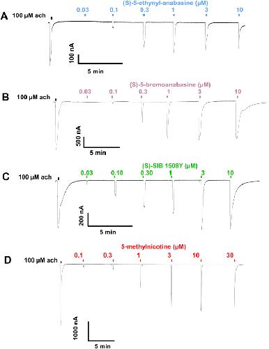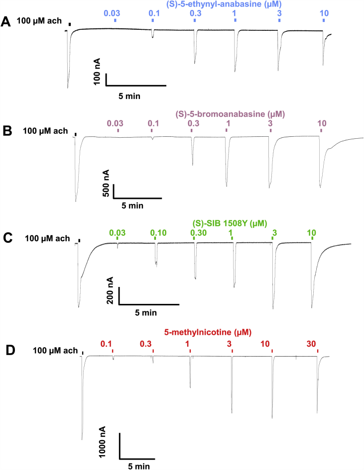 Fig. 4. Sample concentration-current recording traces for the most potent nicotine derivatives on the Asu-ACR-16 receptor. (S)-5-ethynyl-anabasine (A), (S)-5-bromoanabasine (B), (S)—SIB 1508Y (C), 5-methylnicotine (D) are depicted. For each nicotine derivative, 5 oocyte were tested as replicates. Resting membrane potential clamped at −60 mV. Downward responses to exposure of the agonists show opening of the ion-channel. Peak responses were recorded, normalized and fitted into the Hill equations.