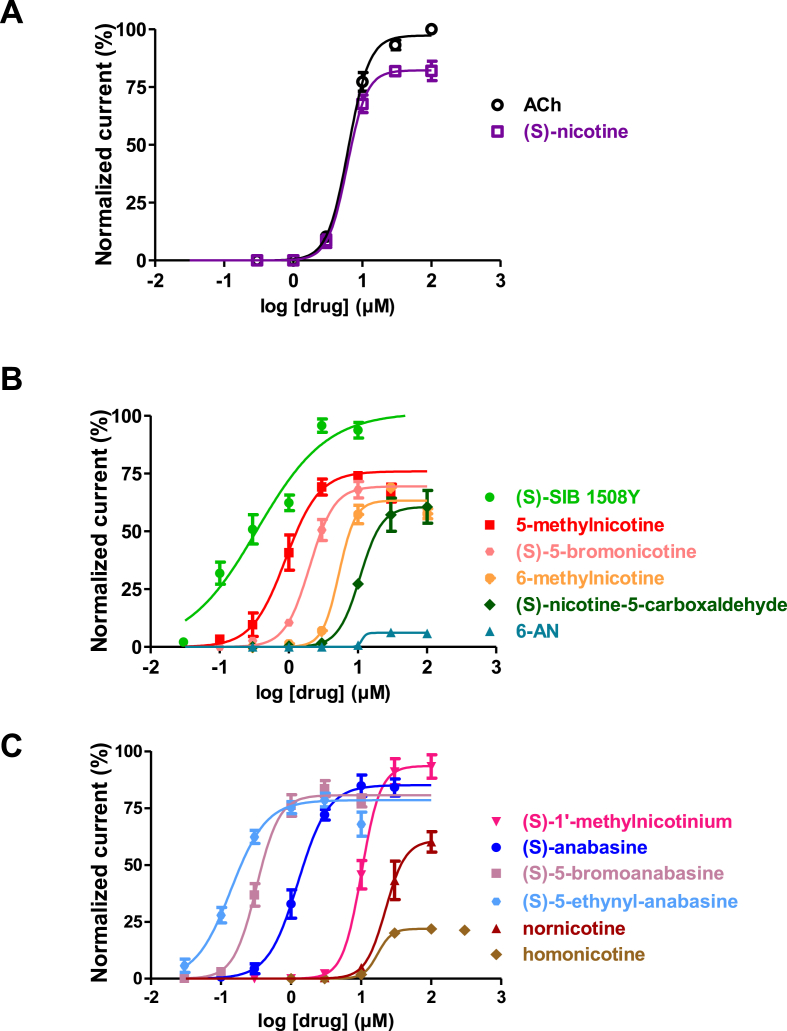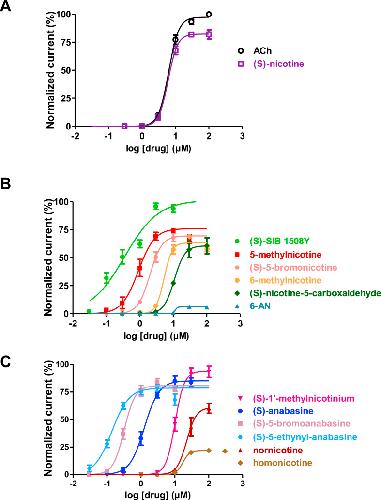 Fig. 5. Dose-response curves of nicotine derivatives for Asu-ACR-16. For experiment of each nicotine derivative, one oocyte was used as a group. Five replicates were performed for each group. Current responses are normalized to the first 100 μM control application (Methods).(A) ACh and (S)-nicotine as two controls.(B) Pyridine ring substituted derivatives. Responses of 30 μM 5-methylnicotine and 100 μM 6-methylnicotine are shown but were not included for fitting the Hill equation to estimate EC50, nHand Imax correspondingly due to their inhibitory effects at high concentrations.(C) Pyrrolidine ring substituted derivatives. Response of 300 μM homonicotine is shown but was not included for fitting the Hill equation to estimate EC50, nHand Imax due to its inhibitory effect at high concentration.