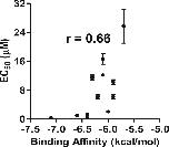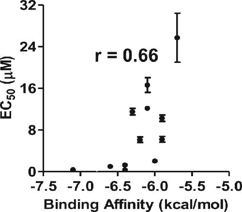 Fig. 6. Correlations between binding affinities (kcal/mol) of each derivative in the apo form Asu-ACR-16 and EC50 (μM) (A), binding affinities (kcal/mol) for the selected nicotine derivatives. The correlation coefficients (r) was used for evaluating the linear regression between affinities and pharmacological parameters (r = 0.66, P < 0.05).