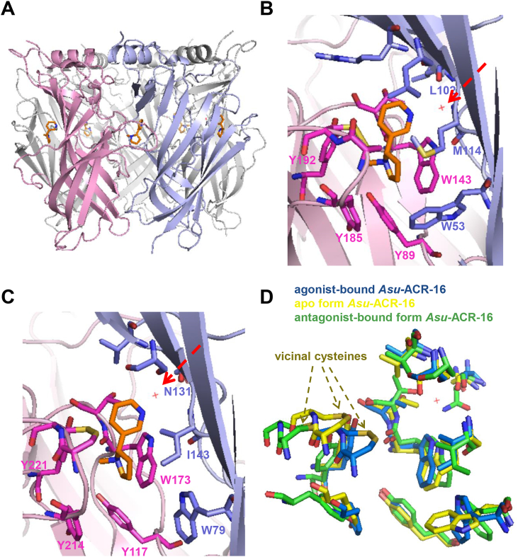 Fig. 1. Crystal structure of Lst-AChBP bound with nicotine (PDB code: 1UW6) and the agonist-bound model of Asu-ACR-16.(A) Ribbon diagram of the AChBP co-crystalized with nicotine, as viewed with membrane at the bottom. The principal subunit is highlighted by light pink and the complement subunit is highlighted by light purple, for clarity. Nicotine (orange) is bound in the five ligand-binding sites in the extracellular domain of AChBP.(B) Close view of the AChBP ligand-binding site. The principal subunit in light pink, the complementary subunit in light purple. Residues interacting with nicotine (orange) are represented as sticks ((+), pink; (−), purple), and water molecule is shown as red dot, view with membrane at the bottom.(C) Close view of the agonist-bound model of Asu-ACR-16 ligand-binding site. The principal subunit in light pink, the complementary subunit in light purple. The interacting residues are represented as sticks ((+), pink; (−), purple), and water molecule is shown as red dot, view with membrane at the bottom. (D) Superposition of residues in agonist-binding site, among agonist-bound form (blue), apo (no ligand) form (yellow), antagonist-bound form (green) of Asu-ACR-16 models are shown. (For interpretation of the references to colour in this figure legend, the reader is referred to the web version of this article.)