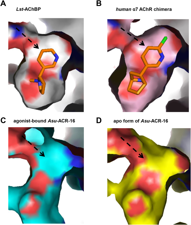 Fig. 2. Ligand-binding sites of Asu-ACR-16 and its homologous proteins.(A) Surface representation in the open-up ligand-binding site of Lst-AChBP in complex with nicotine (PDB code: 1UW6). Oxygen-rich area (red), nitrogen-rich area (blue) and carbon-rich area (gray) are displayed. Empty space was observed around the 5-pyridine ring of nicotine, which suggests that the ligand-binding site is in favor of the linear functional group linking toward the 5-pyridine ring of nicotine. Little space is found around the pyrrolidine ring of nicotine.(B) Surface representation in the open-up ligand-binding site of human α7 AChR chimera in complex with epibatidine (PDB code: 3SQ6), viewed by the same angle as (A). Oxygen-rich area (red), nitrogen-rich area (blue), carbon-rich area (pink) and chloride (green) are displayed. The azabicyclic ring N1 of epibatidine was superimposed with the pyrrolidine ring N2 of nicotine, while the pyridine ring N2 of epibatidine was superimposed with the pyridine ring N1 of nicotine.(C) Surface representation in the open-up ligand-binding site of agonist-bound Asu-ACR-16 model, viewed by the same angle as (A). Oxygen-rich area (red), nitrogen-rich area (blue) and carbon-rich area (cyan) are displayed. Assuming the nicotine has the same binding pose as in (A) within the agonist-bound Asu-ACR-16, empty space around the 5-pyridine ring and pyrrolidine ring of nicotine, which allows nicotinic derivatives with modification in these positions fit into to the binding site. The black arrow indicates the likely orientation of the 5-pyridine ring moiety. (D) Surface representation in the open-up ligand-binding site of apo form Asu-ACR-16 model, viewed by the same angle as (A). Oxygen-rich area (red), nitrogen-rich area (blue) and carbon-rich area (yellow) are displayed. Assuming the nicotine has the same binding pose as in (A) within apo form Asu-ACR-16, there would be empty space around the 5-pyridine ring and pyrrolidine ring of nicotine, which would make the nicotinic derivatives with modification in these positions fit in the binding site. (For interpretation of the references to colour in this figure legend, the reader is referred to the web version of this article.)