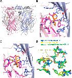 Fig. 1. Crystal structure of Lst-AChBP bound with nicotine (PDB code: 1UW6) and the agonist-bound model of Asu-ACR-16.(A) Ribbon diagram of the AChBP co-crystalized with nicotine, as viewed with membrane at the bottom. The principal subunit is highlighted by light pink and the complement subunit is highlighted by light purple, for clarity. Nicotine (orange) is bound in the five ligand-binding sites in the extracellular domain of AChBP.(B) Close view of the AChBP ligand-binding site. The principal subunit in light pink, the complementary subunit in light purple. Residues interacting with nicotine (orange) are represented as sticks ((+), pink; (−), purple), and water molecule is shown as red dot, view with membrane at the bottom.(C) Close view of the agonist-bound model of Asu-ACR-16 ligand-binding site. The principal subunit in light pink, the complementary subunit in light purple. The interacting residues are represented as sticks ((+), pink; (−), purple), and water molecule is shown as red dot, view with membrane at the bottom. (D) Superposition of residues in agonist-binding site, among agonist-bound form (blue), apo (no ligand) form (yellow), antagonist-bound form (green) of Asu-ACR-16 models are shown. (For interpretation of the references to colour in this figure legend, the reader is referred to the web version of this article.)
