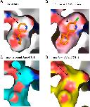 Fig. 2. Ligand-binding sites of Asu-ACR-16 and its homologous proteins.(A) Surface representation in the open-up ligand-binding site of Lst-AChBP in complex with nicotine (PDB code: 1UW6). Oxygen-rich area (red), nitrogen-rich area (blue) and carbon-rich area (gray) are displayed. Empty space was observed around the 5-pyridine ring of nicotine, which suggests that the ligand-binding site is in favor of the linear functional group linking toward the 5-pyridine ring of nicotine. Little space is found around the pyrrolidine ring of nicotine.(B) Surface representation in the open-up ligand-binding site of human α7 AChR chimera in complex with epibatidine (PDB code: 3SQ6), viewed by the same angle as (A). Oxygen-rich area (red), nitrogen-rich area (blue), carbon-rich area (pink) and chloride (green) are displayed. The azabicyclic ring N1 of epibatidine was superimposed with the pyrrolidine ring N2 of nicotine, while the pyridine ring N2 of epibatidine was superimposed with the pyridine ring N1 of nicotine.(C) Surface representation in the open-up ligand-binding site of agonist-bound Asu-ACR-16 model, viewed by the same angle as (A). Oxygen-rich area (red), nitrogen-rich area (blue) and carbon-rich area (cyan) are displayed. Assuming the nicotine has the same binding pose as in (A) within the agonist-bound Asu-ACR-16, empty space around the 5-pyridine ring and pyrrolidine ring of nicotine, which allows nicotinic derivatives with modification in these positions fit into to the binding site. The black arrow indicates the likely orientation of the 5-pyridine ring moiety. (D) Surface representation in the open-up ligand-binding site of apo form Asu-ACR-16 model, viewed by the same angle as (A). Oxygen-rich area (red), nitrogen-rich area (blue) and carbon-rich area (yellow) are displayed. Assuming the nicotine has the same binding pose as in (A) within apo form Asu-ACR-16, there would be empty space around the 5-pyridine ring and pyrrolidine ring of nicotine, which would make the nicotinic derivatives with modification in these positions fit in the binding site. (For interpretation of the references to colour in this figure legend, the reader is referred to the web version of this article.)