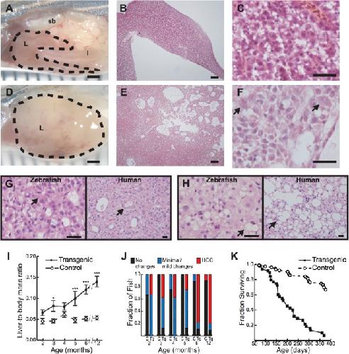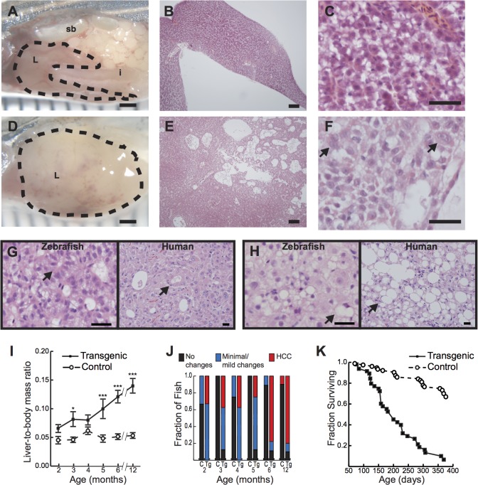 Fig 1. Hepatocyte-specific expression of activated β-catenin results in liver enlargement, hepatocellular carcinoma (HCC), and decreased survival in adult zebrafish.(A-C) Control 4-month-old zebrafish showing the liver (L, outlined) positioned in the body cavity near the intestine (i) and swim bladder (sb)(A). Sections show an orderly arrangement of hepatocytes (B-C). (D-F) Transgenic 4-month-old zebrafish showing an enlarged liver (D) with disorganized architecture (E) and atypical cells (arrows, F). (G-H) Transgenic 6-month-old (G) or 4-month-old (H) zebrafish and human HCC showing architectural disruption with scattered pseudoglands (arrows, G) and evidence of intracellular lipid accumulation (arrows, H). Hematoxylin and eosin stains; scale bars, 1 mm (A, D), 100 μm (B, E), 25 μm (C, F), and 20 μm (G, H). (I) Graph showing average liver size normalized to total body mass, ± standard error of the mean (SEM). Asterisks indicate p-values for ANOVA comparing transgenic zebrafish (N = 56) to control siblings (N = 51) at the same time point: *, p<0.05; ***, p<0.001. (J) Livers of transgenic zebrafish (Tg, N = 49) and control siblings (C, N = 37) were examined microscopically, and architectural and cytological changes were scored. HCC was significantly more common in transgenic zebrafish than in controls (p<0.001, Fisherâs exact test). (K) Kaplan-Meier survival curves comparing adult survival of transgenic zebrafish (N = 51) and control siblings (N = 85); p<0.001, logrank test. |