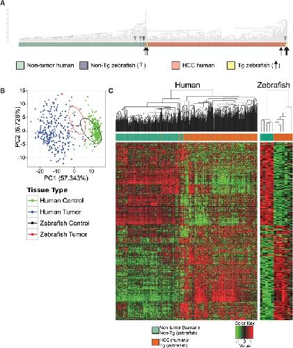 Fig 2. Cross-species comparison of Tg(fabp10a:pt-β-cat) zebrafish and human HCC.(A-B) Analyses of Tg(fabp10a:pt-β-cat) zebrafish RNA-seq data and publicly available human microarray data based on a subset of 283 orthologous gene pairs that are significantly dys-regulated in human HCC samples when compared to adjacent non-tumor human liver samples. (A) Dendrogram illustrating hierarchical clustering of merged human and zebrafish samples, showing that 5 of 7 transgenic zebrafish livers cluster with human HCC and 4 of 5 non-transgenic zebrafish livers cluster with non-tumor human liver. (B) Principal component analysis of Tg(fabp10a:pt-β-cat) zebrafish livers, non-transgenic control livers, human HCC, and non-tumor human liver. Ellipses indicate the 95% confidence intervals of the first two principal components for the respective groups. (C) Heatmaps of human and zebrafish orthologs that are significantly dys-regulated in the same direction in both human HCC samples and Tg(fabp10a:pt-β-cat) animals when compared to their non-tumor counterparts (FDR < 0.05). |